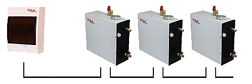 Устанавливается в смежном техническом помещении. Пар подается в парную по трубам. Пульт управления позволяет регулировать температуру, влажность, освещение, вентиляцию, подачу ароматов и т.д. Для покрытия паром большого помещения, можно объединить парогенераторы подключив их последовательно к одной панели управления.